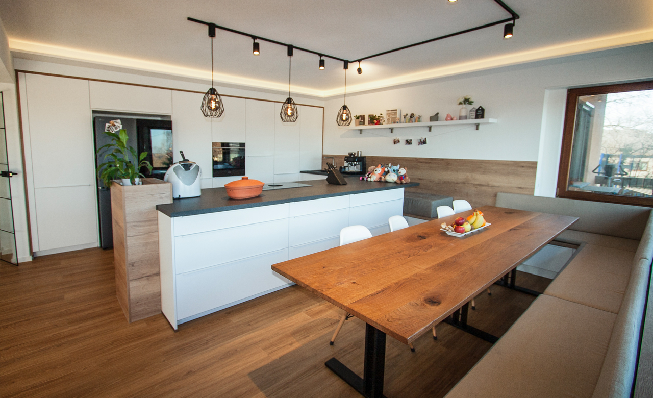 Gesamtergebnis ist ein durchdachter und harmonischer Koch- und Essbereich, mit dem gewünschten Plus an Stauraum, einer Eckbank und optimaler Integration unseres Wunschkühlschranks. Für uns perfekt. Außerdem sind wir sehr glücklich über die Empfehlung, die Küche in einen anderen Raum zu verlagern. Wir fühlen uns sehr gut beraten und empfehlen gerne weiter.“